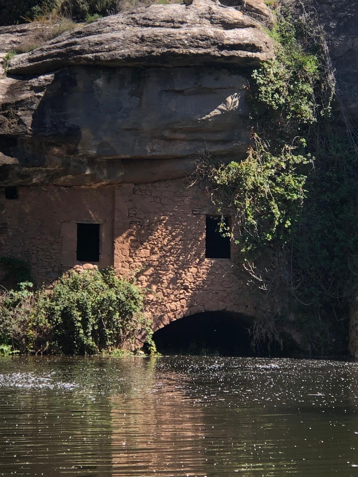 Així ho fem, valents i valentes, buscant els millors passos, per les lloses de pedra de la llera i alguns troncs o roques. Després de les darreres pluges hi baixa aigua però és de bon passar. Si ens hi fixem encara hi podem veure, tot travessant la riera damunt de les roques, alguns dels forats d’una antiga passera segurament feta amb trons, que conduïa al molí.